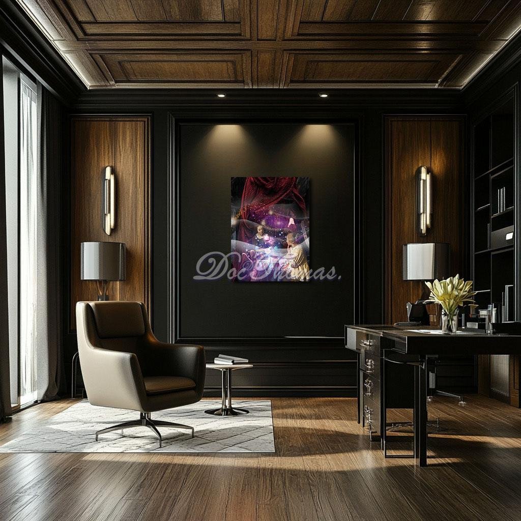 Orbits of Silence: The Letter Between the Stars reimagines Vermeer’s Mistress and Maid as a cosmic ritual where a simple letter glows with the weight of planetary destiny. Within a surreal galaxy cradled by a giant hand and draped in crimson mystic cloth, the two women exchange more than words—they share gravity. The mistress’s dress shimmers with gold and ivory under starlight, while the maid’s calm steadiness glows with cosmic blue. Between them float orbs of memory and fate, casting their private moment into a galactic cathedral of silence. This reinterpretation elevates intimacy into myth, turning a whispered message into a map of the stars.