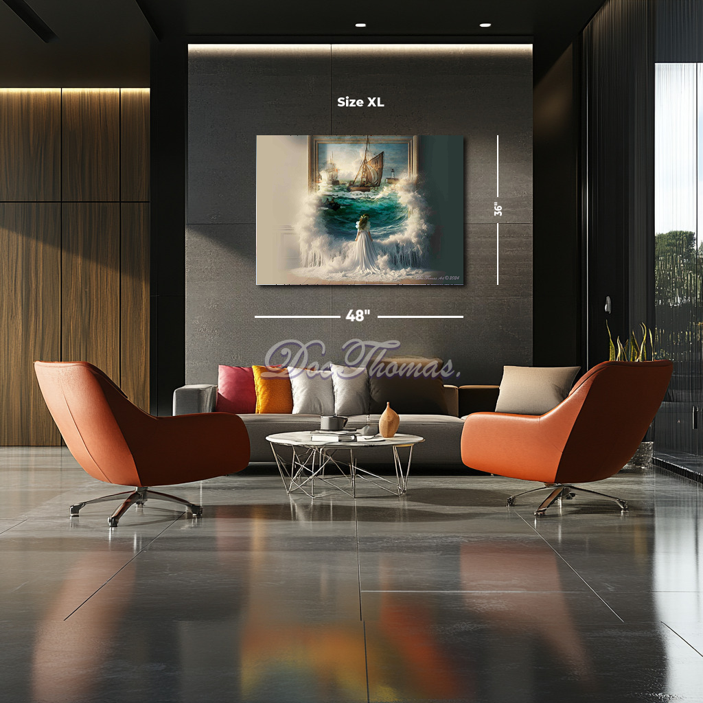 In this conceptual reinterpretation, Monet's original vision is elevated to new realms of fantasy and imagination. Here, the seascape has burst forth from the confines of its gilded frame, pouring into the very room of the viewer as if defying the physical constraints of art. It becomes an allegory of limitless potential, of crossing thresholds from the confines of reality into realms of boundless imagination. What Monet had once observed and captured now extends beyond the canvas, overtaking the structured boundaries of the artwork's frame, challenging perceptions of what can be contained or defined.