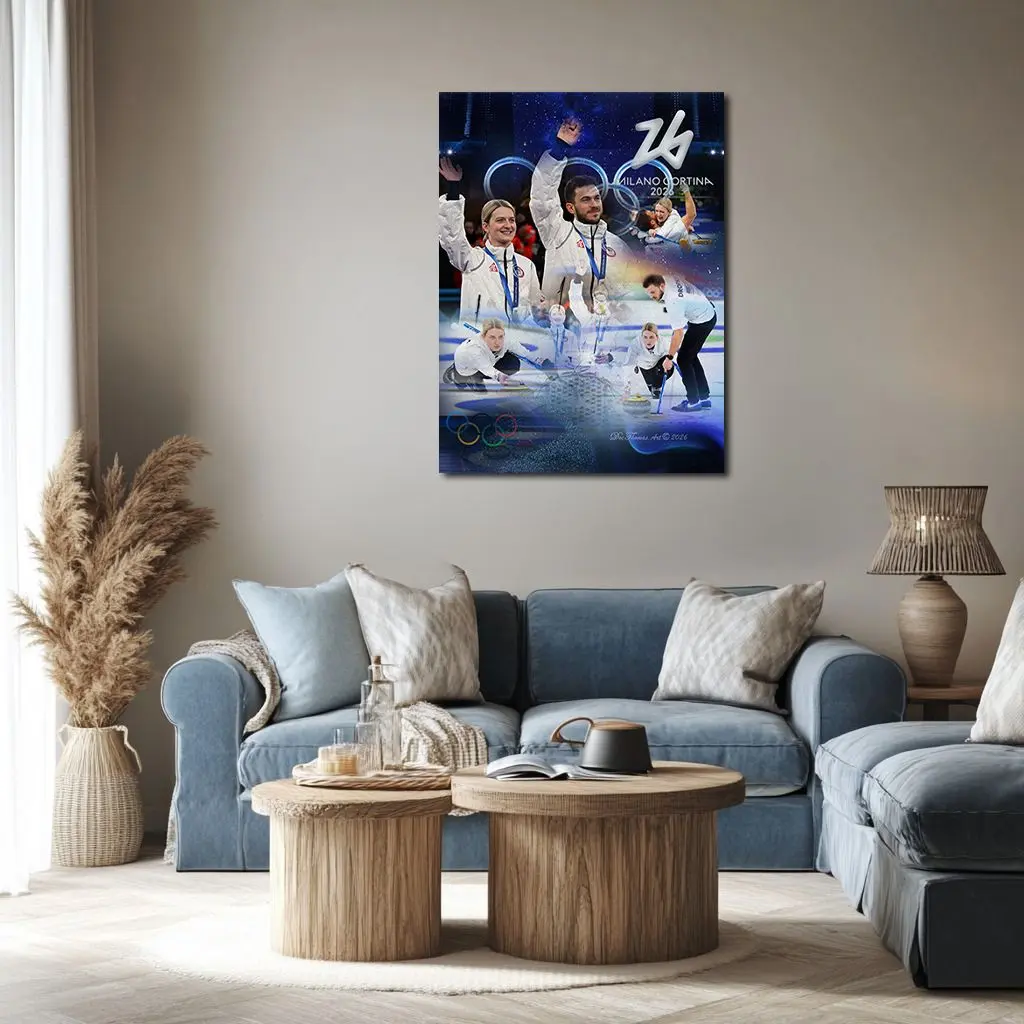 Color symbolism in the composition reflects both environment and competitive psychology. Deep cerulean blues mirror the cold lucidity of Olympic ice, where decision-making must remain undistorted by pressure. Brilliant white jackets worn during podium ceremony signify precision and composure. Crimson accents drawn from Team USA insignia express controlled aggression — the willingness to attempt narrow-port takeouts or freeze draws under medal tension. The silver medal itself radiates reflective coolness, acknowledging a performance that met the highest international standard short of gold.
