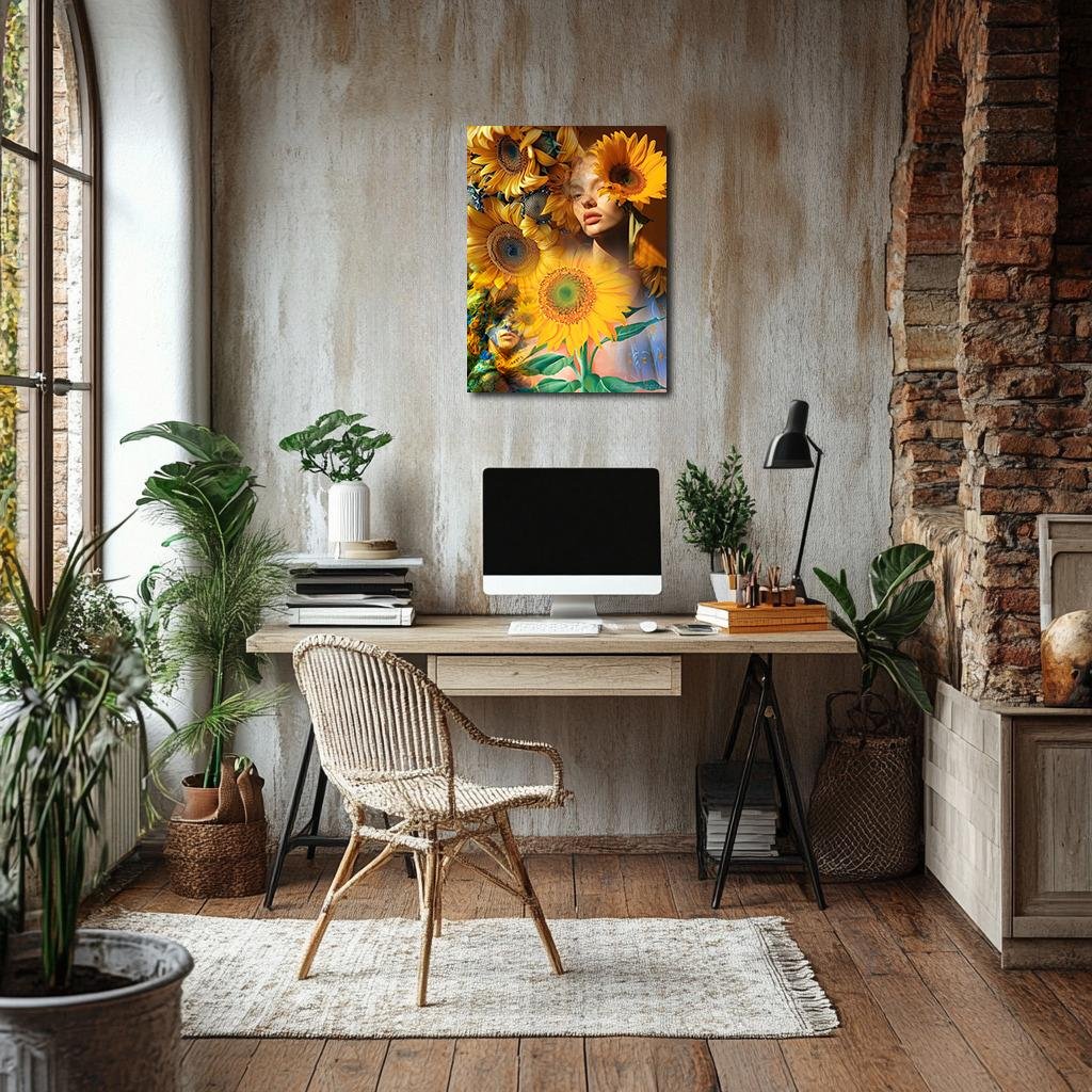 Beneath and beside the flowers, the figure of a young woman rises as if in bloom herself. Her presence is ephemeral and luminous. Her skin is tinted with gold, her cheeks brushed with sunflower glow. There is no harsh line separating her body from the flowers around her—her jawline dissolves into yellow petals, her shoulder into a green stalk. She is not holding the flowers but dissolving into them, becoming one with their vertical ambition and solar symbolism.