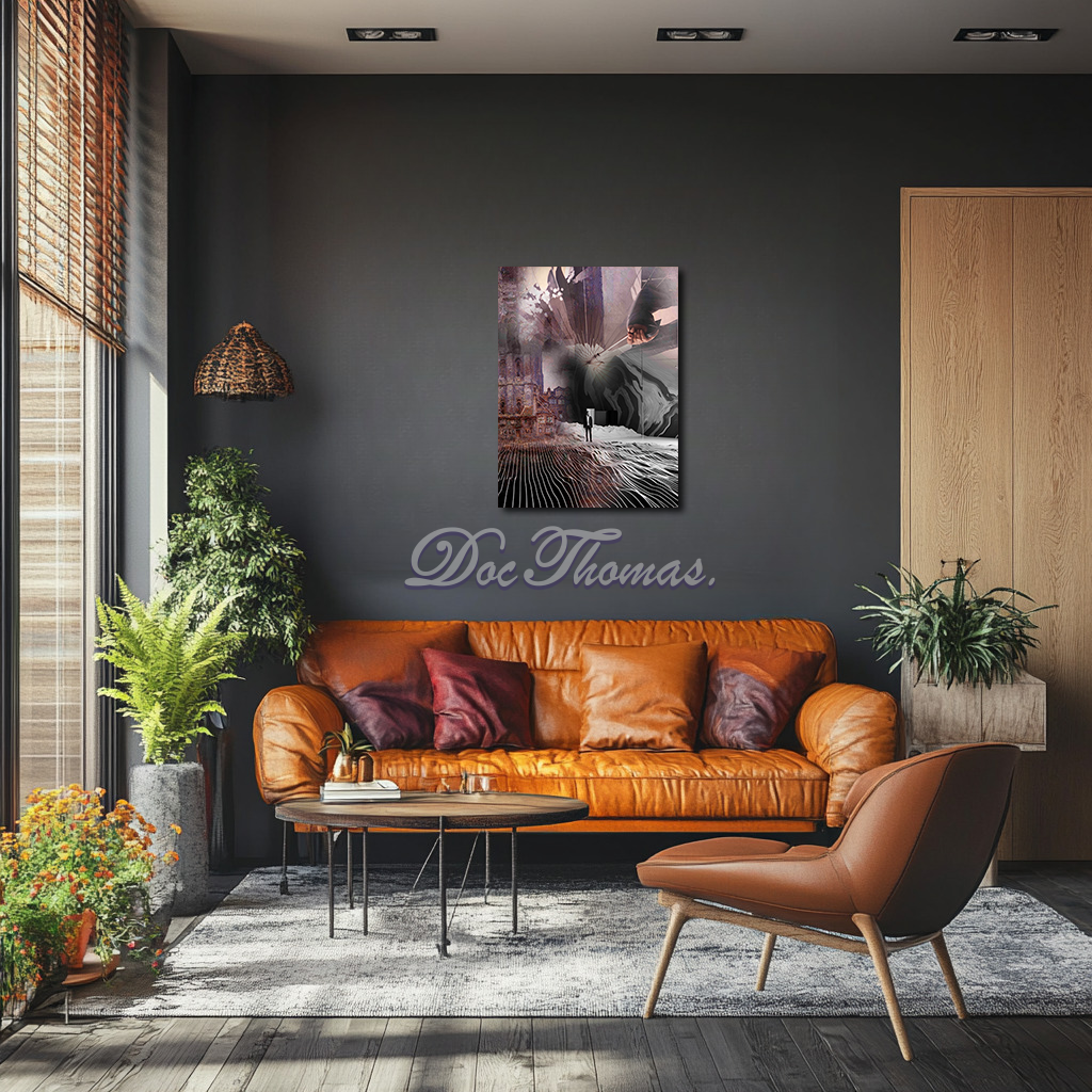 This conceptual reinterpretation of Monet’s The Cour d'Albane, Grey Weather (1892) presents the familiar landscape as a mysterious realm of ambiguity and introspection. A solitary figure, sharply defined, stands amidst surreal abstractions and geometric patterns that blur into Monet’s soft, muted vision. A large hand controlling delicate strings symbolizes humanity’s attempt to impose clarity upon a fluid reality. This artwork explores the tension between the illusion of human control and the inherent ambiguity of perception, reflecting on how our inner landscapes continually reshape our experience of the external world.