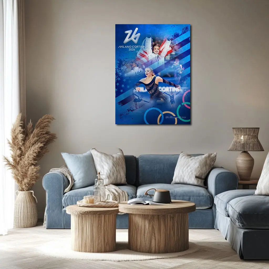 Color symbolism within the composition reflects her performance architecture. Electric cobalt blues evoke the cold lucidity of Olympic ice — a surface maintained near –5°C ice temperature to preserve blade penetration consistency. White podium imagery conveys structural clarity and composure. Crimson tonal accents, drawn from Team USA insignia, represent disciplined intensity — the controlled aggression required to execute high-base-value jump passes late in the program when fatigue accumulates.