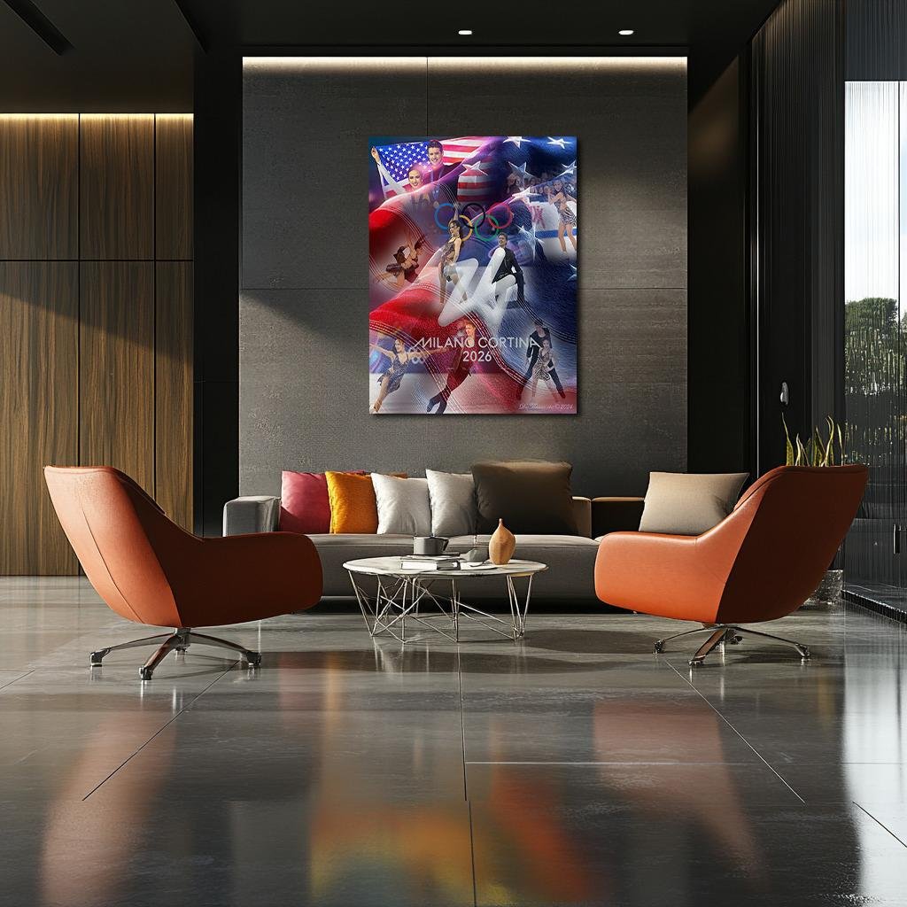 A vertical column of deep sapphire rises through the composition like a stabilizing spine, and along that axis Madison Chock and Evan Bates extend their arms beneath the American flag — not in spectacle, but in calibrated affirmation. This second rendering preserves their Milano Cortina 2026 legacy with the same structural precision that defined their skating: balance before flourish, alignment before applause, mathematics before myth. It is not merely an image of victory; it is a document of equilibrium sustained across multiple Olympic stages.