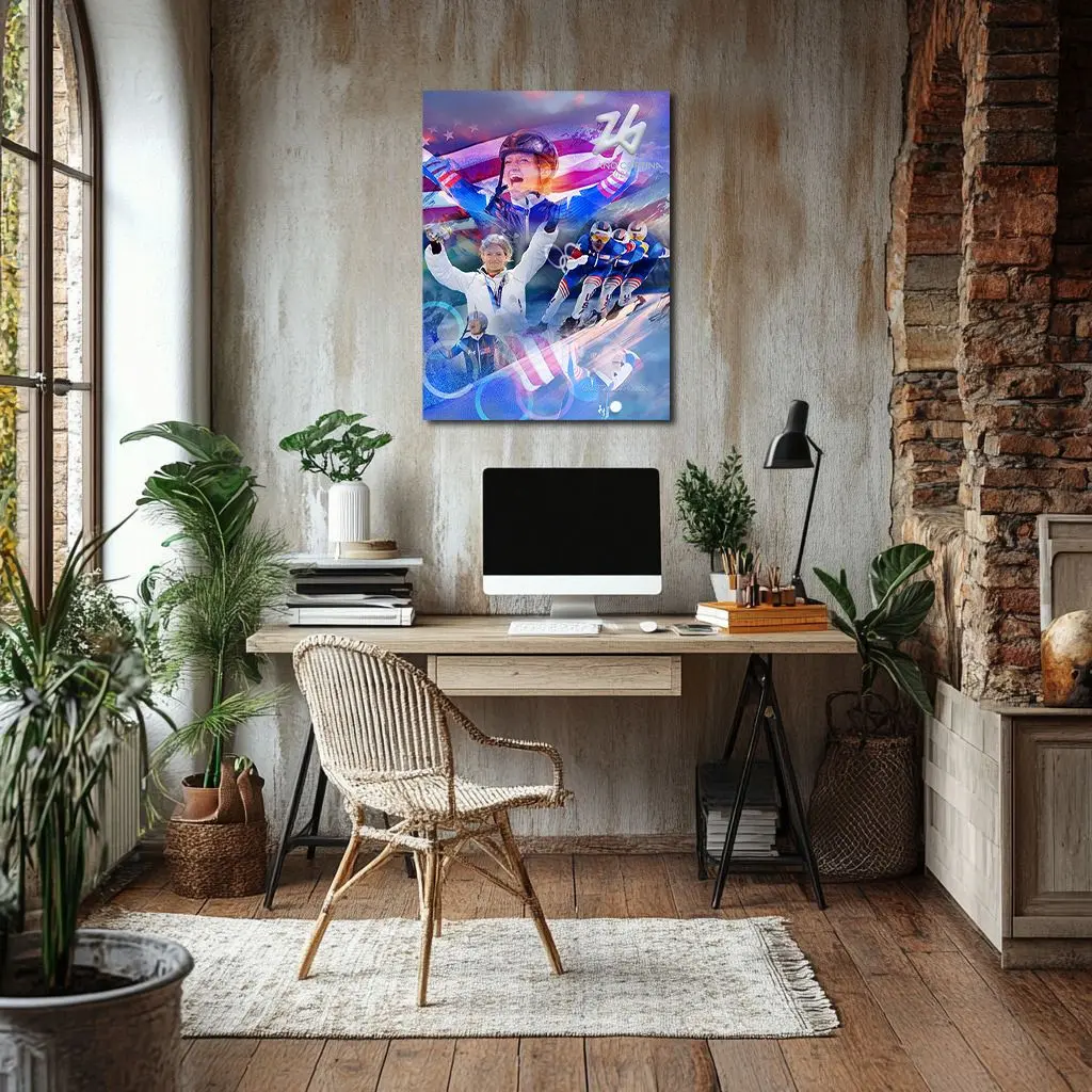 At the Milano Cortina 2026 Olympic Games, Mia Manganello earned Bronze in the Women’s Mass Start, contested over 16 laps (6,400 meters) with intermediate sprints at laps 4, 8, and 12 and a decisive final sprint awarding 60–40–20 points. Crossing third in the final sprint secured 20 points and Olympic bronze. Averaging approximately 30–33 seconds per lap before final acceleration, the event demanded aerodynamic drafting and tactical positioning. Through circular cobalt arcs symbolizing lap repetition and warm bronze illumination marking podium placement, the artwork transforms 6,400 meters of strategic racing into enduring Olympic distinction.