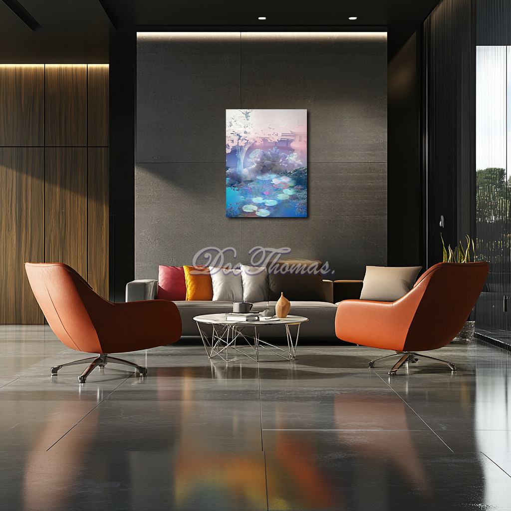 Monet’s original Water Lilies series was conceived as a place of refuge for the soul. This conceptual reimagining extends that idea by removing the painting entirely from the dimension of time. It creates a liminal environment, suspended between consciousness and rest, where nature becomes abstraction and stillness is not absence, but presence. The garden becomes less about looking and more about being.