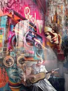 Vermeer’s original subject—a woman lost in the melody of her own creation—becomes the center of a storm spun by decades of musical upheaval. Behind her rise monumental boomboxes, graffiti-tagged walls, and collaged cassette decks that evoke the tactile resistance of past soundscapes. Vinyl, mixtapes, and neon signs are not accessories in this reinterpretation—they are memory triggers, relics of a different rebellion, a pulsing heartbeat of a generation that translated life through basslines and breakbeats. The strings of her baroque guitar dissolve into the wires and circuits of modern amplification, making her music echo across centuries.