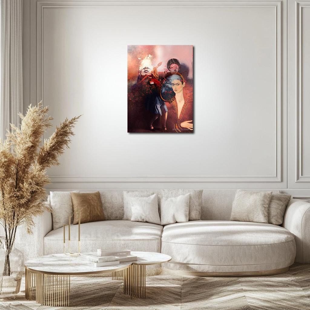 The First Mirror reimagines Frida Kahlo’s Self-Portrait in a Velvet Dress as a surreal threshold between reflection and emergence. With velvet reds, gold filigree, rose-blood branches, and glowing ivory, the piece traces Kahlo’s early act of self-creation as a profound gesture of authorship. Surrounded by ghosted figures and burning visions, her image becomes the center of a dreamlike orbit, where artist and muse are born together in one steady, defiant gaze.