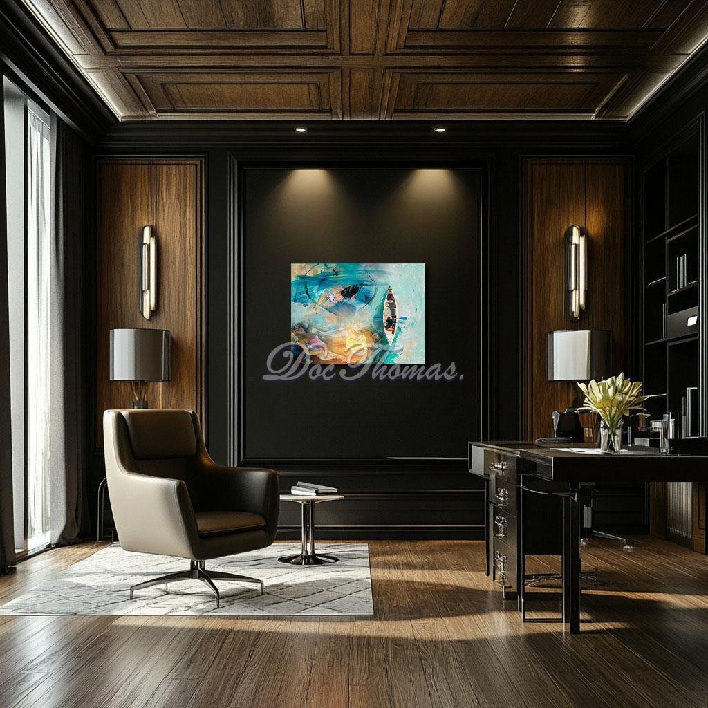 The rowboat stands out with clean contrast: a crisp white hull, warm wooden planks, and cool blue oars. These choices ground the viewer visually while also emphasizing the concept of control and navigation. The blue of the oars harmonizes with the surrounding water but is more saturated—like decisions cutting through ambiguity. Around the boat, light olive tones fade into thin brushstrokes, echoing watercolor textures to maintain the dreamlike environment.