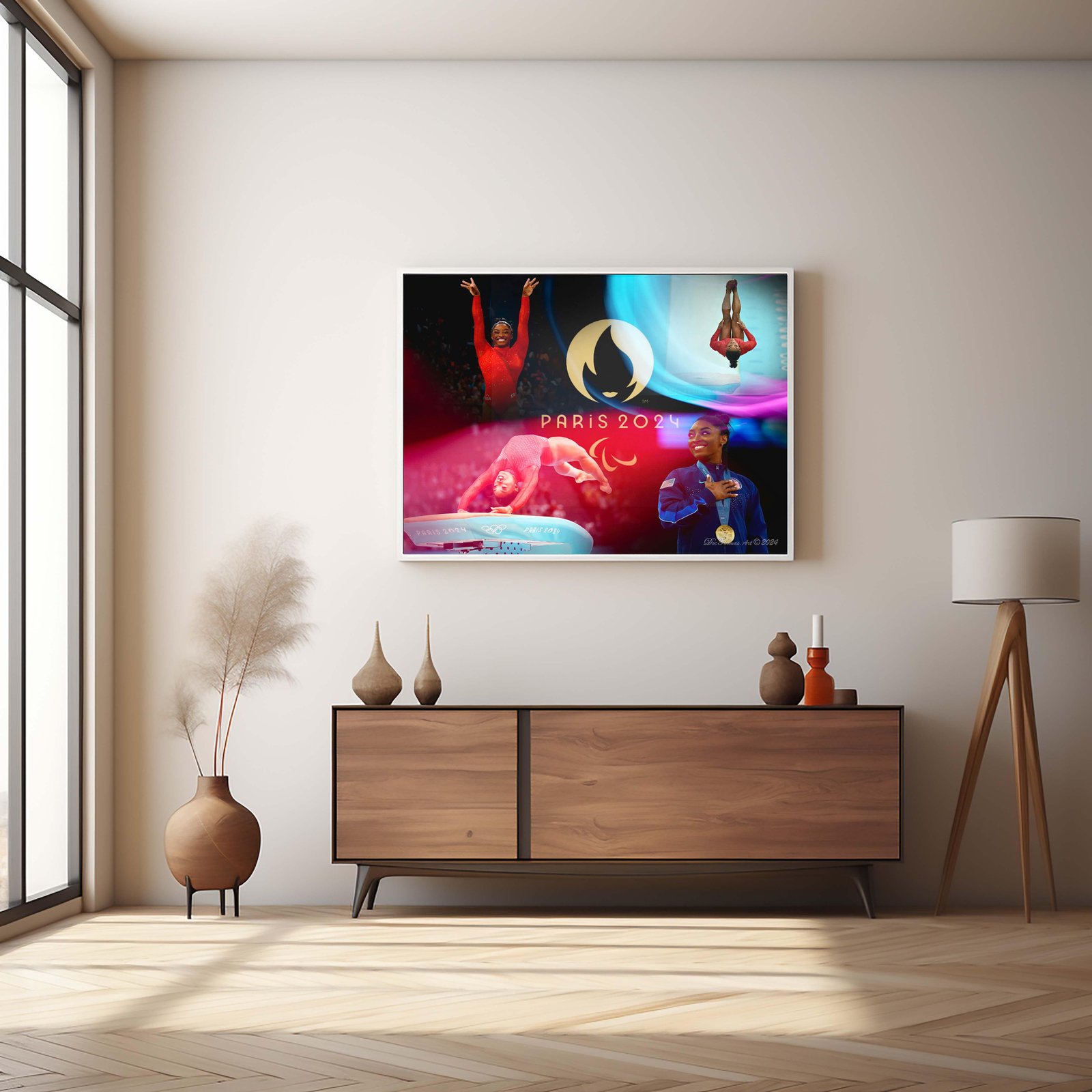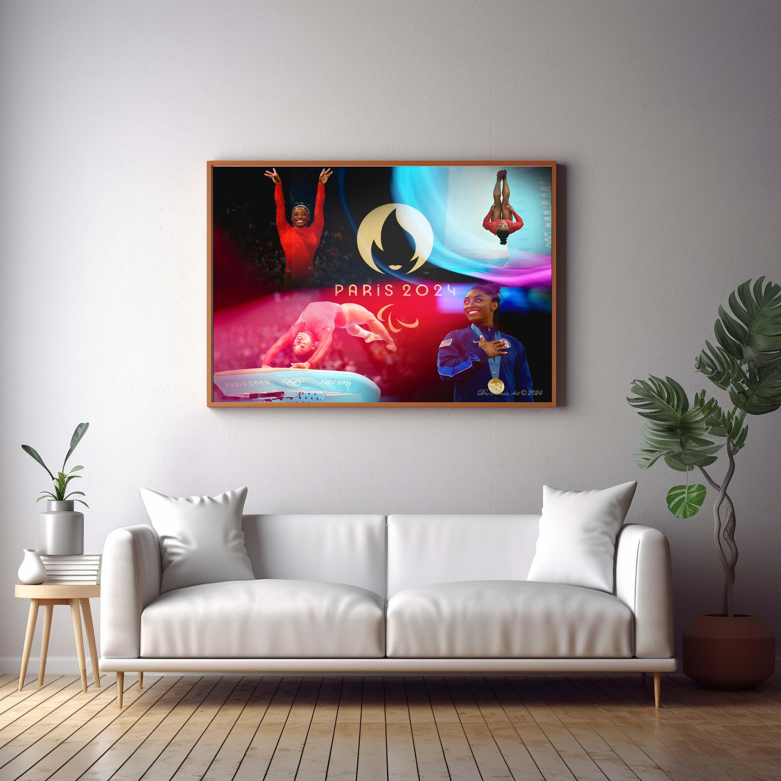 This artwork encapsulates the essence of Biles' journey—her grace, power, and the joy she brings to the sport. It's a celebration of her achievements and an acknowledgment of the strength it takes to rise above challenges. The Paris 2024 logo serves as a reminder of the global stage where she continues to shine, inspiring millions around the world.
