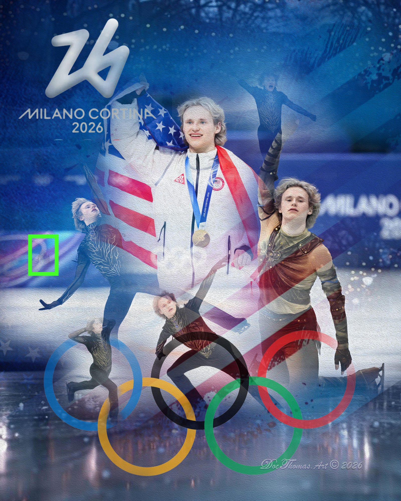 Ultramarine Apex documents Ilia Malinin’s Milano Cortina 2026 Olympic ascent through disciplined chromatic structure and structured numerical continuity. In the Team Event at the Milano Ice Skating Arena, he scored 104.58 (TES 60.14 / PCS 44.44) in the Short Program and 198.76 (TES 113.52 / PCS 85.24) in the Free Skate, earning the maximum 20 placement points toward Team USA’s gold. In the Individual competition, his combined 309.14 total (106.03 SP / 203.11 FS) secured Olympic Gold. Through layered ultramarine fields symbolizing technical precision and softened cobalt gradients representing interpretive fluency, the artwork transforms structured Olympic mathematics into vertical apex — quadruple flight resolved into gold.