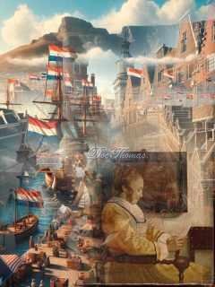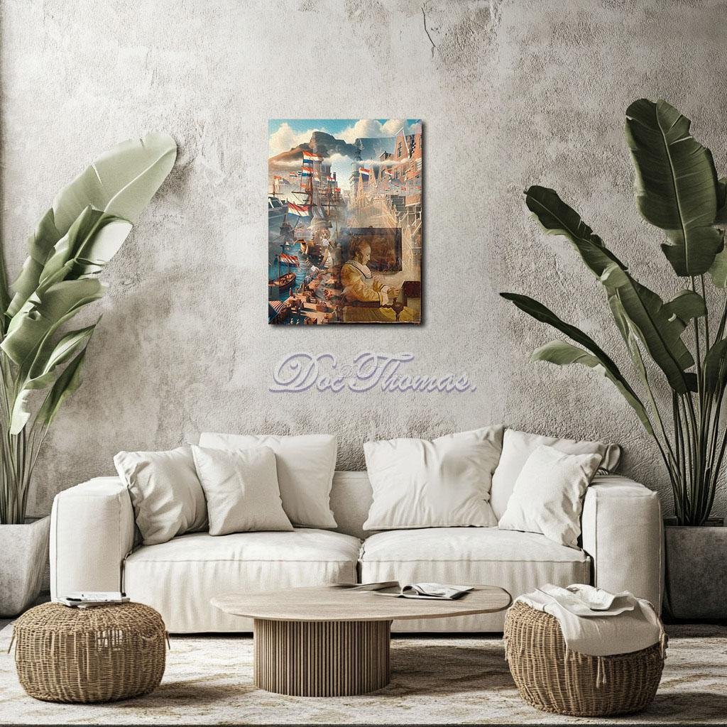This is why the collage layers so purposefully. Her face is still Vermeer’s—gentle, open, contemplative—but her surroundings have been expanded, reframed, and painted over with time. Behind her, sails rise like wings. The harbor is no longer a backdrop—it is an extension of her breathing. And the Dutch flags are not symbols of pride or dominance, but of responsibility—fluttering in soft rhythm with the heartbeats of those forgotten by the empire they signify.