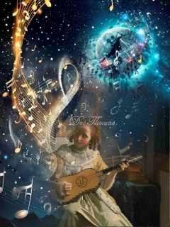 The color palette transitions from Vermeer’s familiar amber-browns and muted creams into iridescent blues, nebula-pinks, and radiant golds. Her cream dress, which once suggested modest femininity, now glows with the aura of myth—bathed in silver starbursts and kissed by lavender shadows. The guitar, retaining its rich honeyed hue, becomes the gravitational core of the piece—each pluck radiating sound waves rendered as radiant crescents and glowing motes. The night sky is painted with deep teals and infinite indigos, speckled with flecks of light like Pollock’s splatters gone galactic. The music notation becomes visual comet trails, bending with motion, emotion, and unseen gravity.