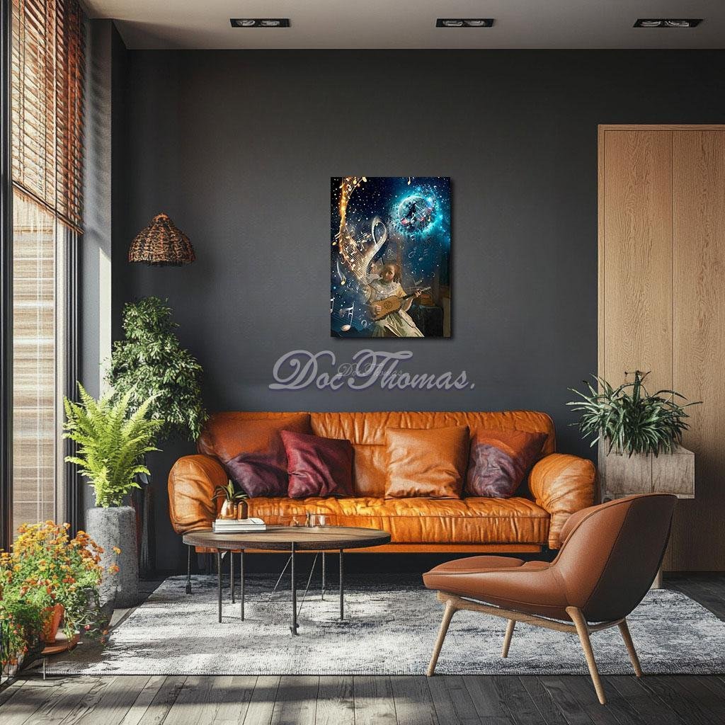 Vermeer’s warm, baroque elegance is retained in the girl’s gentle posture and delicate gaze, but her world has been transfigured. Behind her, the domestic setting dissolves into celestial infinity. A trail of luminous notes spirals around her like stardust, guiding the viewer’s eye to an erupting moon where a silhouetted dancer glides across staves of glowing music. The background, once a quiet panel of shadowed calm, is now a stage for universal resonance—planets swirl in time to her rhythm, and cosmic breezes ripple through the chords of the universe.