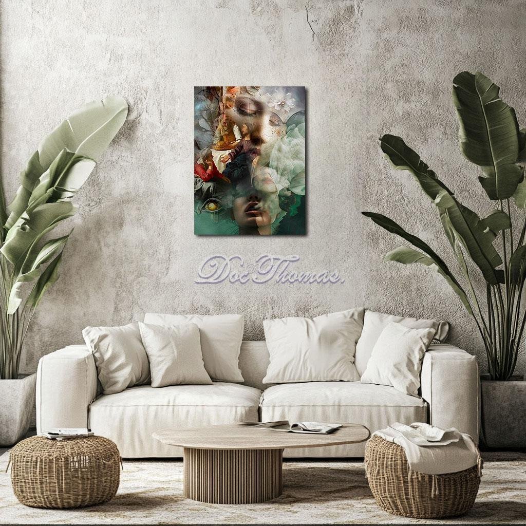 Veins of Porcelain: Beneath the Breath of Light transforms Vermeer’s Christ in the House of Martha and Mary into a surreal landscape of emotional resonance and spiritual breath. The figures drift between cracked porcelain faces, swirling smoke, and spectral petals. Christ’s quiet presence radiates across time, mirrored in the closed eyes of a woman unraveling within herself. Reds, moss greens, and ashen pinks carry the palette from grounded ritual to metaphysical awakening. This reimagination collapses narrative into inner vision—where the divine sits beside longing, and every breath is a prayer half-whispered through broken light.