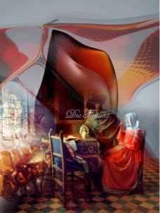 Veins of Porcelain: Beneath the Glaze of Intention reimagines Johannes Vermeer’s The Wine Glass as a meditation on emotional ambiguity and the slow, viscous movement of consent, ritual, and unspoken social performance. The original’s quiet tension—a woman sipping wine under the gaze of a man—becomes here an allegory for time itself folding into emotional viscosity. Through a surreal layering of textures and distorted forms, the wine glass no longer sits merely on the table—it spills across the atmosphere, stretching itself into abstract ribbons of red, amber, and longing.
