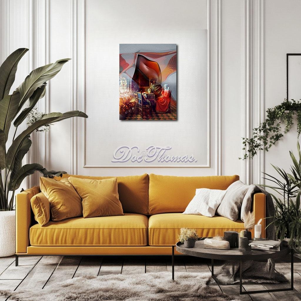 The architectural serenity of Vermeer’s domestic space remains intact, but now it feels suspended within a melted hourglass. The figures—he in shadowed restraint, she draped in a blood-tinted gown—are no longer simply actors in a courtship. They are enclosed, almost embalmed, within the molten swell of a larger narrative about societal roles, gendered performance, and the unclear boundary between desire and expectation. The wine, which once glinted politely in a goblet, is now omnipresent—its color bleeding into the air, swallowing the figures in translucent folds of red and orange, creating both heat and pressure.