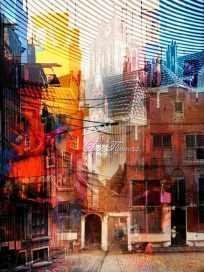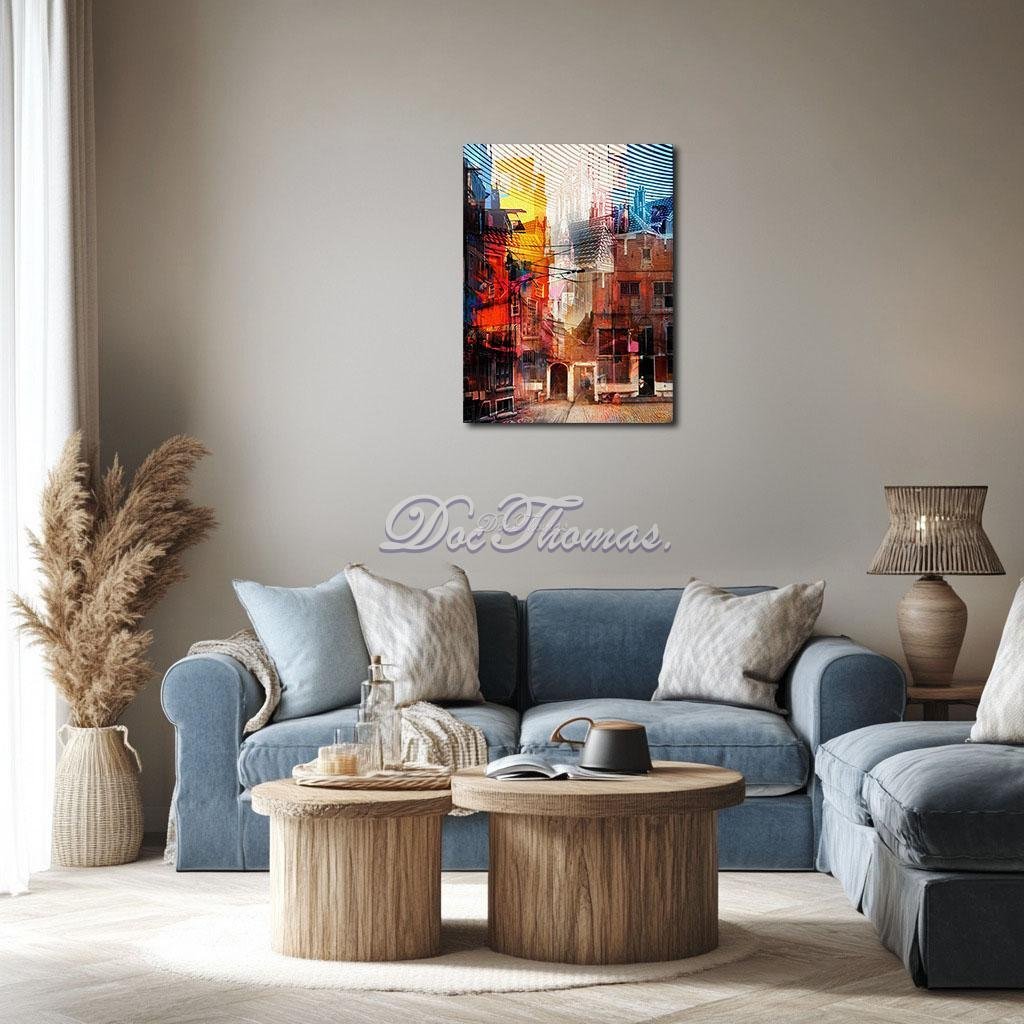 The color palette was crucial to this transformation. Reds were chosen not just to mirror the original brick, but to evoke bloodline and inheritance—what is passed down not in words, but in walls. The electric blues slicing across the rooftops invoke the presence of modernity—like spectral graffiti on the body of history. Bright yellows disrupt and warm in equal measure; they form halos over rooftops, windows, and pathways, making ordinary corners feel sacred. The lower portion, anchored in heavier shadows and faded neutrals, suggests the grounding force of reality—a reminder that all transcendence must stand on something solid.