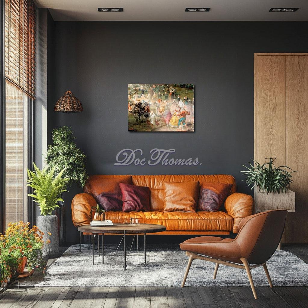 The structure of the room remains, but its solidity is illusion. Wooden beams, light-struck walls, and heavy velvet chairs now drift like sheet music in motion, swirling with clefs and notes that dance in defiance of gravity. Where Vermeer’s girl once delicately plucked harmony into being, now a spectral multitude surrounds her—versions of herself multiplied, aged, remembered. A pianist leans forward, her form stitched into the curved lid of an invisible harpsichord. A standing figure fades into scrolls of music. Another kneels inside the shadowed creases of a skirt that has become a sonata, flaring open like a stage curtain.