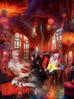 At the heart of this vision remains Vermeer’s triangular arrangement: the young woman with flushed composure, the grinning man extending coin and contact, and the procuress herself—half guardian, half merchant of warmth. But now, they are submerged in a palace of lamp-lit whispers and lantern-bloomed fever. The entire space swells with red—vermillion domes and velvet reflections, coral and cinnabar walls that throb like arteries carrying wine, money, and longing. This is not a room; this is a heartbeat made visible. The once-murky tavern scene now unfolds within a dreamlike harem of glowing arches and murmured transactions.