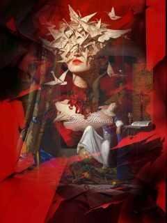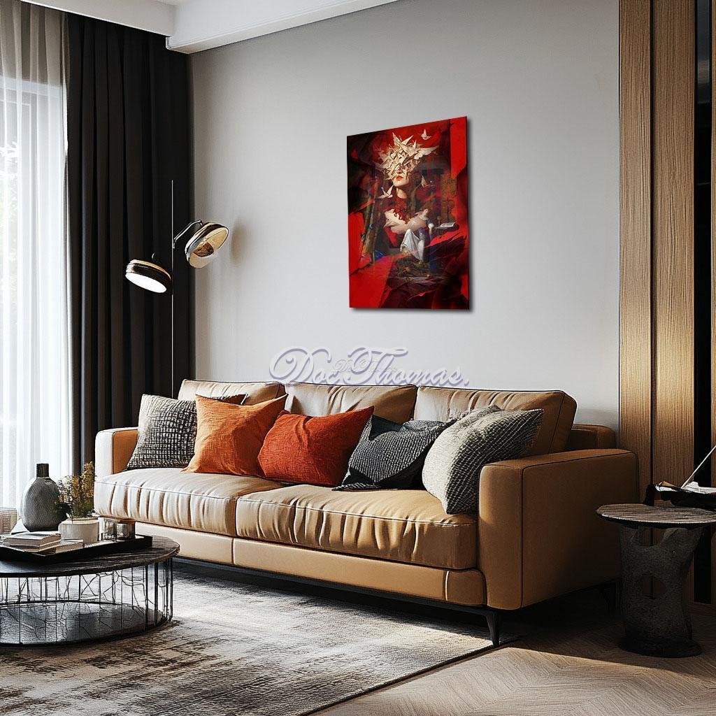 Veins of Porcelain: The Crimson Benediction reinterprets Vermeer’s The Allegory of Faith as a surrealist descent into ecstatic belief and inner combustion. A woman crowned with violent, fluttering origami birds emerges as a divine oracle, her eyes obscured, her silence thunderous. Bathed in visceral reds and shrouded by flying paper doves, she becomes both prophet and martyr. Vermeer’s reclining figure lingers like a sacred echo, anchoring the scene in classical serenity. The color palette—dominated by sacred reds, shadowy blacks, and ethereal whites—evokes spiritual passion, sacrifice, and transcendence. Faith here is not quiet—it burns, folds, erupts, and haunts.