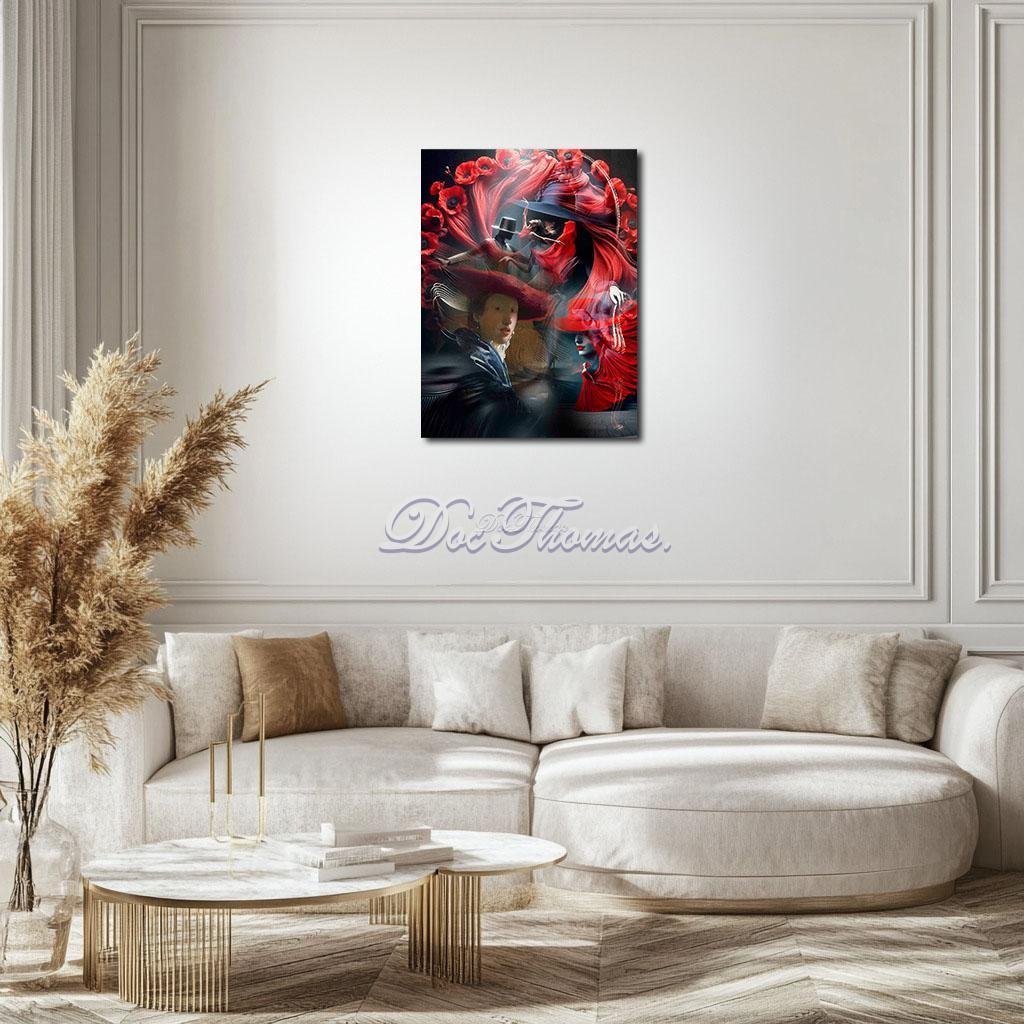 Veins of Porcelain: The Crimson Rehearsal transforms Johannes Vermeer’s Girl with a Red Hat into a theatrical explosion of identity, femininity, and motion. Her red hat unravels into dancers, fabric, and poppies, blooming outward into a surreal stage where identity is endlessly performed and never fully fixed. Crimson dominates the palette, representing desire, danger, and performance, while deep indigo anchors the soul of the girl’s stillness. Swirling lines and theatrical silhouettes surround her, turning Vermeer’s intimate portrait into an opera of becoming. In this reimagination, she is no longer simply observed—she is the one who takes center stage.