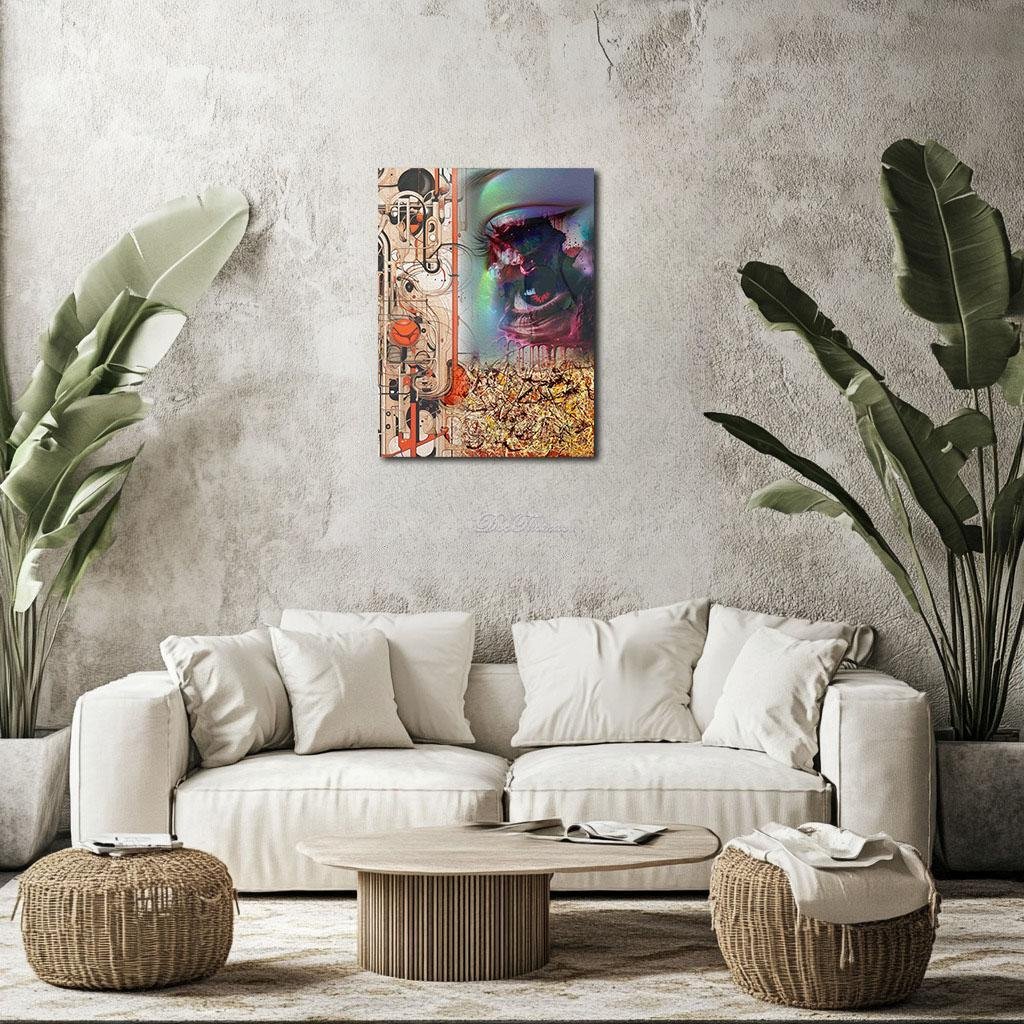 a surreal portrait of sensory collapse. A swollen, weeping eye floats amid circuits and Pollock’s